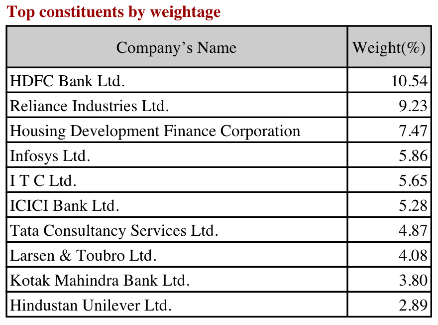 Example : If you were to invest 1000 INR in Nifty 50 Index Fund today , 500 INR would go into the above 10 companies based on the weightage. That is , 10.54% of 500 = 52.7 INR would be invested in HDFC Bank Ltd.