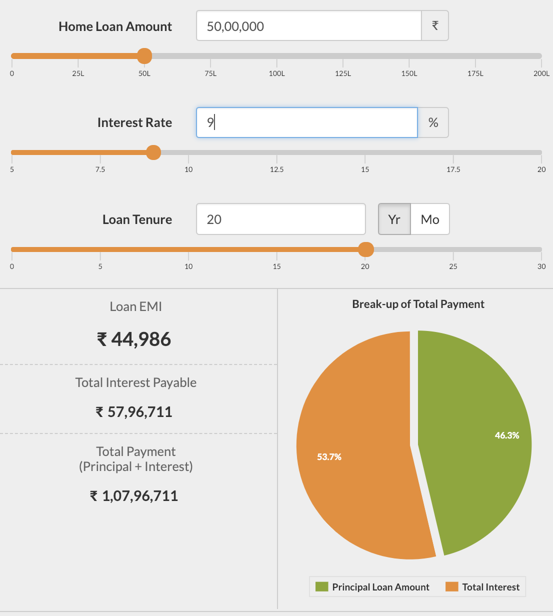 Let’s open our eyes to the harsh reality and see how good an investment mess Mr.Homie has got himself into. Mr.Homie took a home loan of 50L. How much do you think he will be paying in interest at 9% ( as of Jan, 2019 ) for a tenure of 20 years?